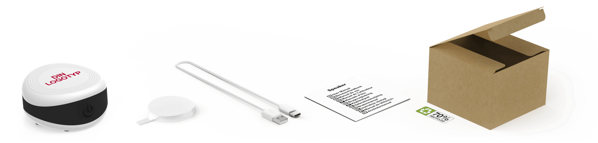 Bluetooth®-namnet är vad användaren ser på sin smartphone eller surfplatta när han parkopplar till sin ljudprodukt. Vi kan anpassa detta namn till ditt varumärke, vilket ger ditt företag ytterligare exponering. Om du inte vill ha den här tjänsten kommer standard namnet "Promo Audio" att tilldelas produkten.Mått och vikt