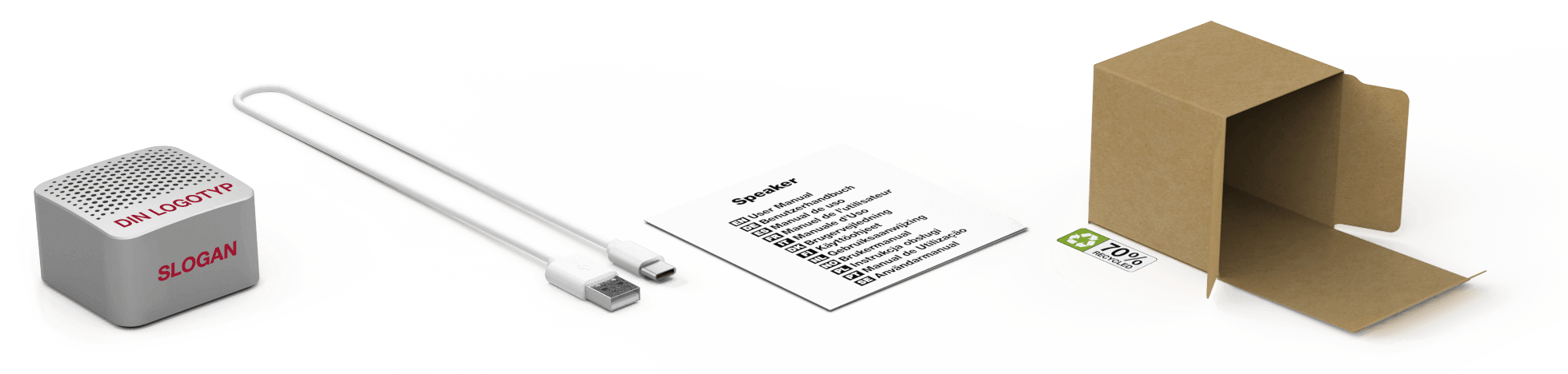 Bluetooth®-namnet är vad användaren ser på sin smartphone eller surfplatta när han parkopplar till sin ljudprodukt. Vi kan anpassa detta namn till ditt varumärke, vilket ger ditt företag ytterligare exponering. Om du inte vill ha den här tjänsten kommer standard namnet "Promo Audio" att tilldelas produkten.Tillbehör