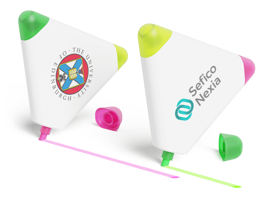 Vår Triple överstrykningspenna har 3 olika highlighters på en modell - gul, grön och rosa. Den iögonfallande triangulära formen gör det också till en extremt populär giveaway-produkt. Vi kan lägga till din logotyp, slogan och mer på båda sidor av Triple - vilket ger dig fantastisk varumärkesexponering på en produkt som kommer att behållas och användas ofta.