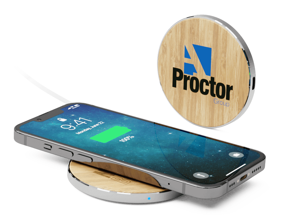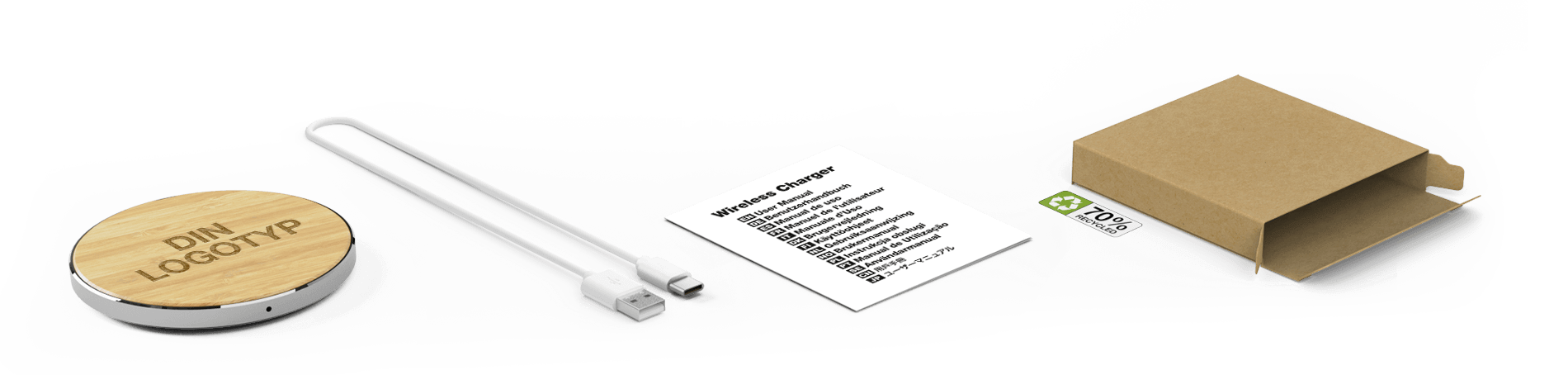 Den naturliga finishen i bambuträ skapar en slående kontrast med livfulla varumärkesbilder, och anpassar ditt företag till miljövänliga värderingar. Välj vår tjänst för individuell namngivning för att skapa personliga trådlösa laddare för nya kunder eller anställda. Alternativt kan du numrera dina enheter för att samla in data inför nästa mässa eller evenemang. Den trådlösa ringladdaren ingår också i våra nya merch-paket, perfekta som gåvor till anställda och kunder!