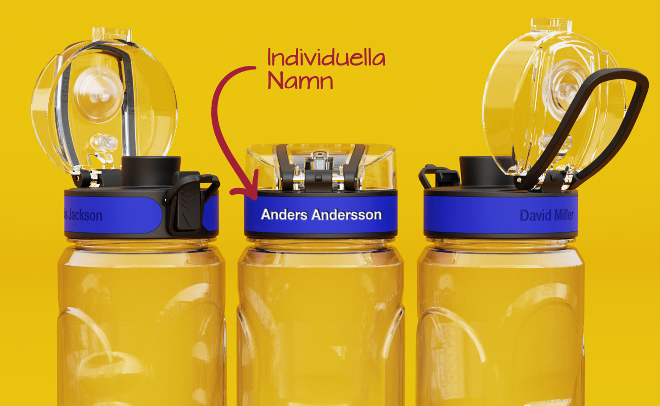 Gravyren skapar en permanent form av namnmärkning. Det är perfekt fär sportsklubbar och skolor, och undviker möjlig förväxling av Vattenflaskor och Resemuggar under träning eller tävlingar. Varje individuellt namn kan tryckas i kombination med er logoty och slogan på Drinkware-produkten.