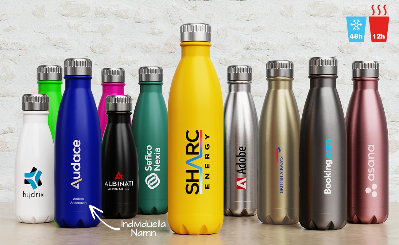 Men viktigast av allt är att våra professionella varumärkesalternativ kommer att visa din valda logotyp eller slogan i högkvalitativa, exakta detaljer. Om du väljer vår klassiska screentryckstjänst kan din logotyp eller slogan märkas på ett enda, stort område på flaskans huvuddel. Med lasergravering kan du dra nytta av ett dubbelt varumärkesområde på flaskan och locket för maximal varumärkesexponering.